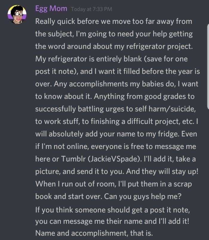 I thought about leaving. After all, what do I have in common with a group of teenagers? I’m old to them! So, I observed. And I noticed something interesting. Many of them were in bad places, with parental figures who didn’t support them. They’d been betrayed by family, by friends. Most of them just wanted someone to be proud of them. I realized then… I had EVERYTHING in common with them. Not only that, but I was in a unique position to share with them my experiences and…being an adult, I could help them. I could spread some of that JackSepticEye PMA (Positive Mental Attitude). I became the mother of the group. It started off simply with reminding them they were loved, telling them I was proud of their accomplishments… But I had no way of showing it. I’m a firm believer in actions speaking louder than words…but how? How can I show almost 300 people that I cared.